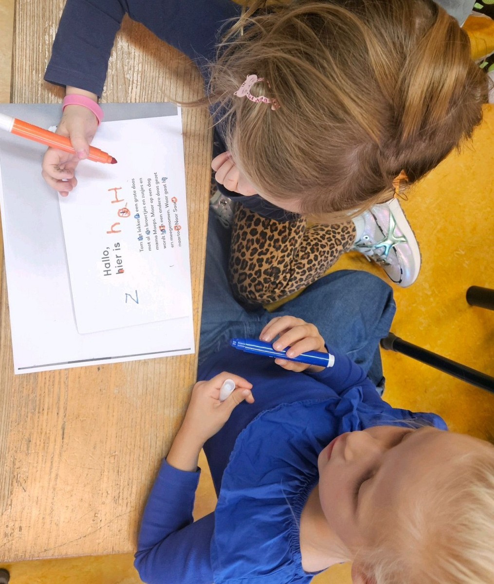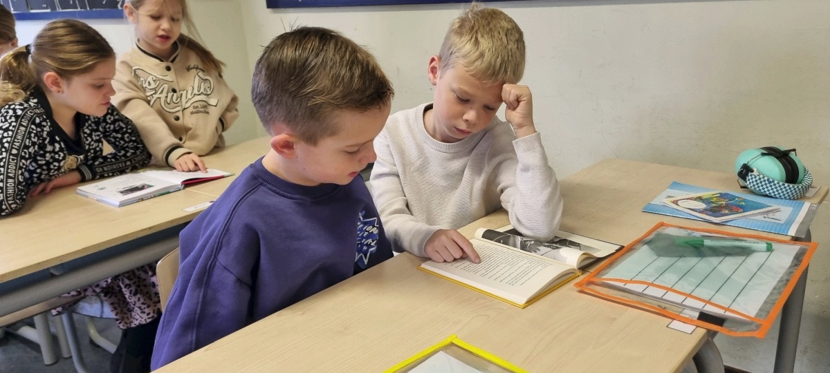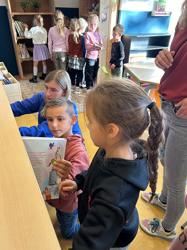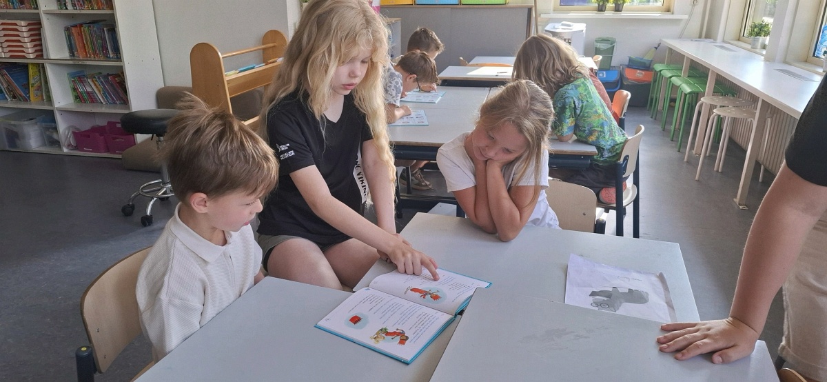 Bij de Hommelgroep lezen de kinderen in tweetallen. De kinderen die al wat vloeiender lezen, doen dit samen met een klasgenoot. Kinderen die meer ondersteuning nodig hebben, lezen met een kind dat een of meerdere groepen hoger zit. Deze oudere leerling fungeert als ‘tutor’.