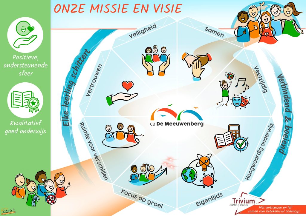 Het onderwijsaanbod bij De Meeuwenberg is veelzijdig en eigentijds, met als doel kwalitatief hoogwaardig en boeiend onderwijs te bieden. We scheppen ruimte voor verbinding met de wereld om de kinderen heen, stimuleren actieve betrokkenheid van ouders/verzorgers en bevorderen samenwerking in de hele school. Gezamenlijk vieren en genieten we van ons onderwijs en van wat daarbij komt kijken!